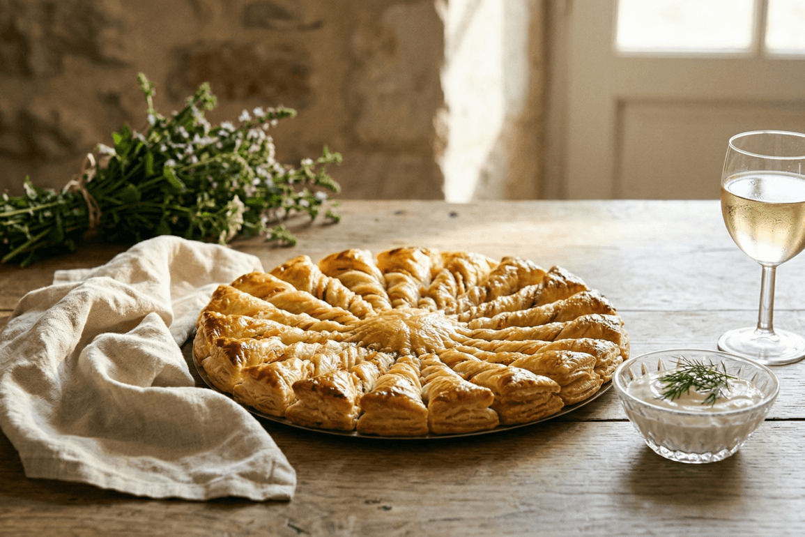 The beauty of the Tarte Soleil lies in its geometry. By twisting strips of pastry outward from the center, you create a “sun” where each guest can simply pull away a warm, flaky ray.